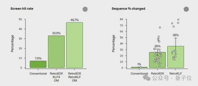 基于RetroSOX的成功经验,研究团队引导模型生成一组增强型RetroKLF变体。最终,模型生成的变体中有14种表现优于RetroSOX筛选中的最佳组合方案——命中率接近50%。