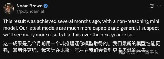 值得一提的是,OpenAI科学家NoamBrown表示,这一模型已经是几个月前的成果,现在的模型性能更强,预计未来一年左右会看到更多新成果。
